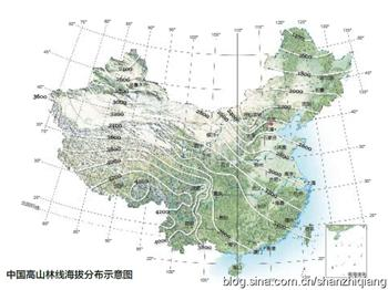 这是一张根据各地山地监测数据以及气象资料推断制作的地图,从中我们可以大致了解到中国高山林线海拔高度。图中可以看出,高山林线的位置呈现出从南向北递减的规律,此外,西部的林线要高于湿润的东部地区。我国林线最高的地区在西藏自治区东南部,海拔高度超过4400米。