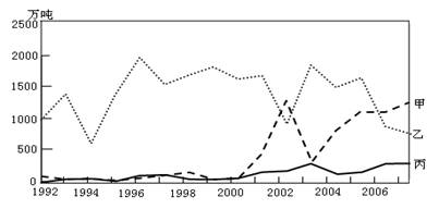 1.曲线甲、乙、丙代表的国家分别为2.乙国2002年小麦出口量突然下降,其原因最有可能是3.关于甲、乙、丙三国,下列说法正确的是