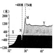 1.图示N湖泊水面与M山峰的相对高度较小值,多出现在2.图示x海区与Y高原分别位于