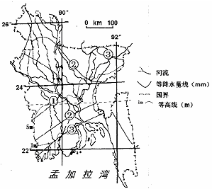 本题解析:1.根据图示该地孟加拉湾,陆地位于恒河三角洲。该地夏季受西南季风影响,受地形抬升,③地降水量最大,①地降水量最少。所以本题选择B选项。