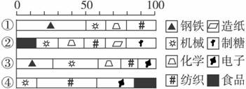 单选题 读“我国四城市主要工业部门结构示意图”,完成下题。