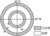 本题解析:第(1)题,依据经度分布可知,此图地球自转方向为逆时针,即北极上空俯视图。甲为北半球的盛行西风带,风向为西南风。第(2)题,图示副热带高气压带分布在30°N~40°N,说明气压带、风带北移,为北半球夏季,地中海沿岸气候炎热干燥。