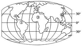 1.①②③④四地的气候主要由海陆热力性质差异造成的是2.②地常年盛行风