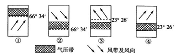 单选题 下图中①、②、③、④为二分二至日气压带、风带分布示意图的一部分,读图回答1—2题。