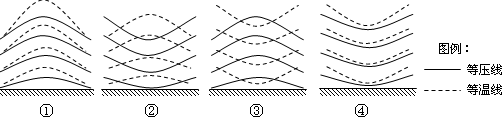 本题解析:1.“燃木崖上”使近地面温度升高,近地面等温线向上凸出,气温升高,气压降低,所以等压面向下弯曲。所以本题选择B选项。