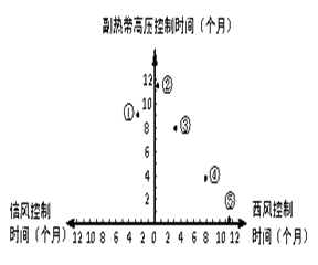 点评:本题难度适中。以沿海地区的五个不同地点受气压带和风带影响的时长为材料来考查学生对五个地区的大气环流及对热带沙漠气候、地中海气候的理解。