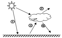 1.根据图示的大气热力作用过程判断,①表示太阳辐射;②表示大气对太阳辐射的反射作用;③表示地面辐射;④表示大气逆辐射。近地面大气的直接热源是地面。