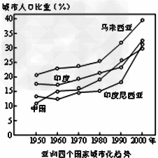 2.根据图中曲线判断,1990至2000年城市化速度最慢的国家是
