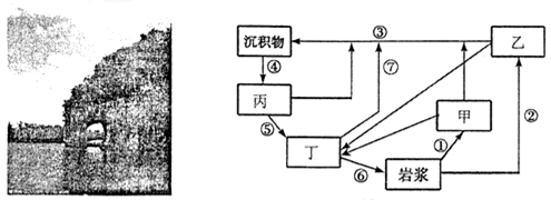 【小题1】桂林山水属于喀斯特地貌,岩石类型是石灰岩。读右图,沉积物经固结成岩作用形成沉积岩,即丙是沉积岩,C对。甲由岩浆形成,是位于地下,是花岗岩。乙喷出地表,是玄武岩。丁是变质岩,A.B.D错。