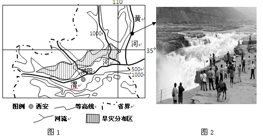 (1)黄河壶口瀑布位于位于黄土高原深处的两省交界处,瀑布流向与此河段的整体流向一致,推断壶口瀑布向??????????(北或南)侵蚀。图1中渭河谷地的成因是?????????????????。(3分)