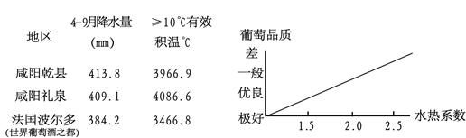 (3)与世界葡萄酒之都相比较,材料中咸阳乾县、礼泉等地的水热系数情况如何?分析该地区葡萄种植的优势自然条件。(4分)