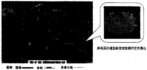 (3)读“库布其沙漠边缘的资源开发的景观图”,说出该资源的名称,并简述该资源的特点及其开发的优势自然条件。(10分)