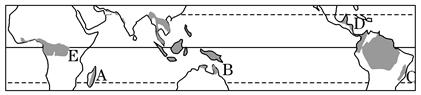 本题解析:试题分析:热带雨林气候分布在赤道附近,受赤道低气压带控制,终年高温多雨,因气流上升强烈,多对流雨;印度半岛有纬度较高,没有热带雨林气候分布。