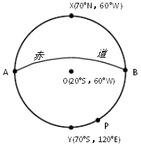 5、单选题 图中圆圈AXBPYA为地球大圆(圆半径等于地球半径),弧AB为赤道,括号中的数据为X、O、Y三地的地理坐标。完成题。