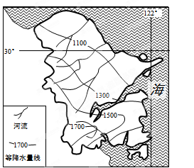 2、单选题 图为我国东部沿海某城市年降水量分布图,全市山地占陆城面积的24.9%,丘陵占25.2%,台地占1.5%,谷地占8.1%,平原占40.3%。全市总人口560万人,其中市区人口210万人。完成问题。