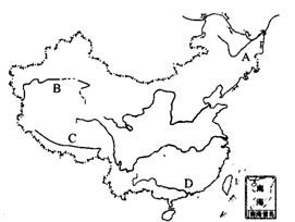本题解析:试题分析:A点北侧为三江平原,属于中温带,盛产春小麦、大豆、高粱、甜菜,A说法正确,B盆地为我国塔里木盆地,属于温带大陆性气候,盛产棉花和多种优质特色瓜果,B说法正确,C高原是青藏高原,地势高,气候凉爽,地势较低的河谷地区可以种植青稞、春小麦、豌豆,C说法正确,D地区为我国珠江三角洲,属于热带,盛产水稻、甘蔗、天然橡胶,不适宜种植冬小麦,D说法错误,故答案选D。