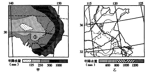 (1)简述甲、乙两地降水空间分布特点,并请选用恰当的图例,在乙图中绘出山东省年降水量大于800毫米以上的区域。(6分)