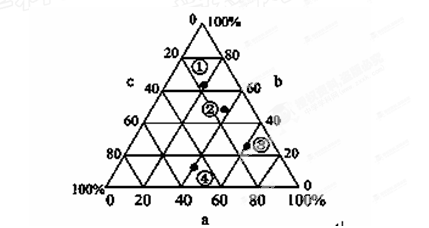 (3)江汉平原(用武汉数据)粮食单产高的主要原因是??????????????????????、 ?????????????????????????????????、??????????????????????????????????????。 (4)要发展我国西部地区的粮食生产,应采取的主要措施是??????????????????? ?????????????????????????????????????????????????????????????????????????? ?????????????????????????????????????????????????????????????????????????? 2、单选题 读下面三角坐标统计图,回答小题。 |