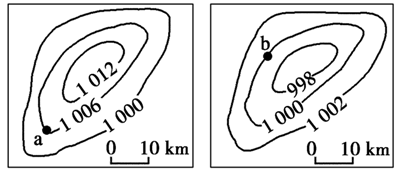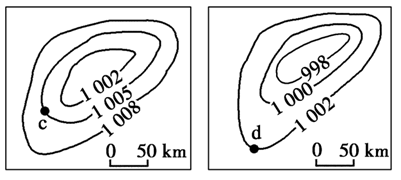【小题2】由图可知 a图、b 图等压线稀疏状况、比例尺、图幅相同,压力差越大( a图气压差为4百帕、b 图为2百帕、c图3百帕、d图2百帕),风力越大。所以a点风力大于b点风力;c点风力大于d点。若等压线疏密程度基本一致则比例尺越大(a图、b 图比例尺大于c图、d图),风力越大。A点、b 点的风力大于c点、d点。通过以上推出四幅气压分布图中,风力最大的点是a点。