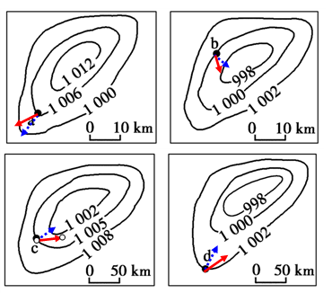 【小题1】如果四图都位于北半球,a、b、c、d四地风向如下图所示:(蓝色虚线表示水平气压梯度力,红色实线表示风向):