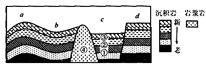 【小题2】从图例分析,①②③属于沉积岩,④为岩浆岩,岩层①到③,年龄由老到新;④侵入到了其他岩层,所以④最后形成,年龄最轻,选D项。