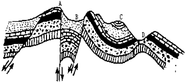 (1)A、B、C、D四处,属于背斜的是 ,属于向斜的是 。