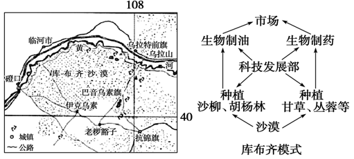 【小题2】根据“库布齐模式”图可知,立足“沙漠”生态治理,科技引领,促进产业发展,取得经济效益。但不属于“技术导向型产业,增加产业链长,附加值高,生态效益好”。 “库布齐模式”更不是以第三产业为主。故选B。
