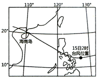 【小题1】此时台风位于菲律宾东部,根据图中经纬度可大致判断出此地距海南的距离约为1500千米。台风移动速度为每小时20千米,由图中位置移动到海南岛东海岸大约需要三天,约在18日移动到海南岛东海岸。