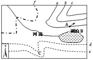 【小题1】等高线在河流处应凸向高值方向,可知该地西北高东南低,河流由西北向东南流;从A处风向箭头知该地地转偏向力向右偏,为北半球;南部等温线e温度应高于d;图中湖泊只受水不出水,水量减少靠蒸发和下渗,盐度会逐渐增大,形成咸水湖。选项D正确。