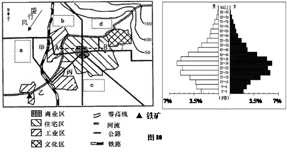 5、综合题 图10是“某城市规划简图”和近年该城市统计的“人口年龄结构金字塔图”,该市常年盛行东北风,读图回答下列问题。