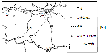 小题3:③位于我国南方低山丘陵地区,交通干线在修建时的主要限制条件是沿线地势起伏大。所以本题选择C选项。