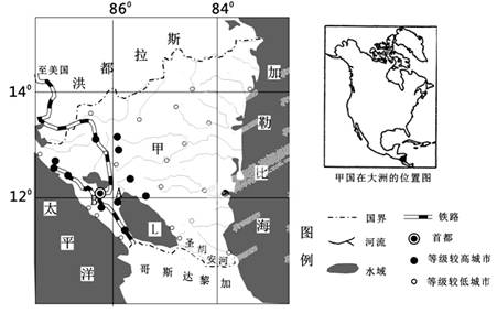 材料一??图是甲国地图。甲国是美国重要的服装进口国,服装生产中心在A城;首都B城是该国重要的工业中心,纺织、食品、制糖是其主要工业部门。