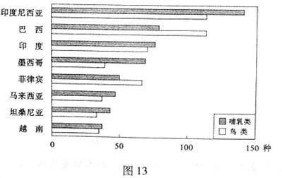 3、综合题 图13是2000年世界濒危物种数量位居前列的部分国家的濒危哺乳动物、鸟类种数统计图。读图回答下列问题.