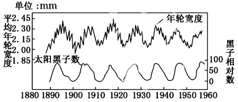 【小题2】年轮宽度的大小表示植物生长的茂盛状况,年轮宽,说明植物生长快,光热水充足,气候条件好;年轮宽度小,说明植物生长较缓慢,光热水资源配合欠佳,气候恶劣,太阳黑子的多少对年轮宽度的影响其实就是对气候产生的影响,所以本题A正确。