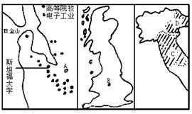(1)根据图示:A位于美国旧金山湾附近,以电子工业为主导,所以A处是著名的新兴工业区硅谷,这里集中了数千家微电子工,是典型的技术密集型工业区。