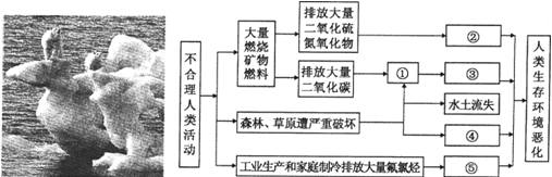 本题解析:本题考查世界环境问题和能源问题。小题1:图示反映部分极冰融化,海平面上升,主要是由于大量排放二氧化碳导致的全球变暖,即③。