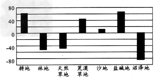4、单选题 读我国某流域2000年部分土地利用类型与1960年比较变化情况(%)图,回答1、2题。??
