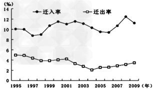 2、单选题 读“1995-2009年我国某省级行政区户籍人口迁移变动情况图”。结合所学知识,完成1-2题