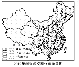 3、单选题 2012年12月3日,阿里巴巴集团在杭州宣布,至11月30日晚9:50,其旗下淘宝和天猫的交易额本年度突破10000亿元;2013牟“双十一”网购狂欢节一天的支付宝交易额达350.19亿。读图完成下列各题。