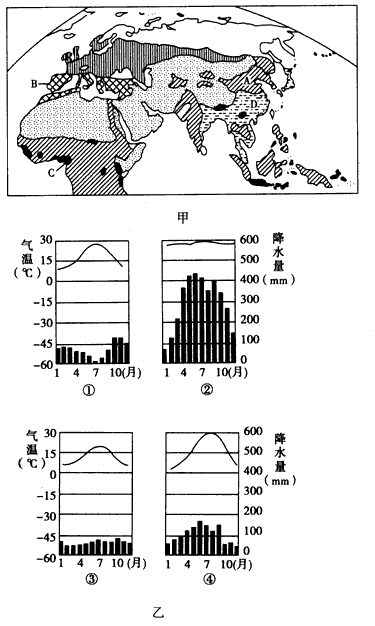 (2)图乙中与农业生产地域类型B相应的气候类型数码代号是______________,与农业生产地域类型C相