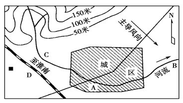 在图中A、B、C、D四地建火电厂、自来水厂、印染厂、食品厂,并要在该城市建一绿化带,从经济、环境效益考虑: