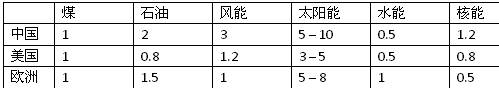 2、综合题 材料一?在坎昆气候会议上,低碳经济、节能减排成为重要议题。下表为欧洲各种能源平均发电相对成本(以煤电成本为1作标准)