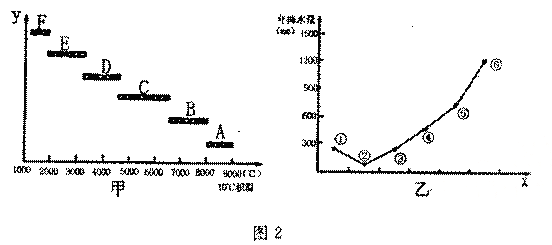 2、单选题 “≥10℃积温”是一年内≥10℃的日平均气温的总和,比如,秦岭——淮河一带大约是4500℃。某研究人员按两个方向,分别选取了A——F和①——⑥共12个地区,依据我国多年平均气候资料,绘成图2中的甲、乙两图。读图回答3~4题。