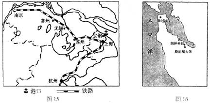 材料二:图15和图16分别为上海宝钢与美国朗泽科技区位示意图。