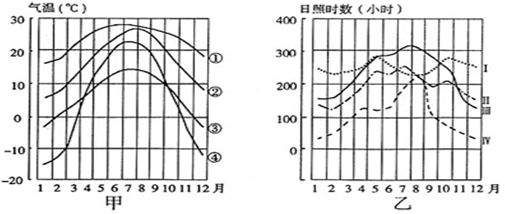 1.题目中提供的四个城市,可以确定拉萨气温受地势影响最大,然后再在图甲中找出代表拉萨的气温曲线。由于拉萨受地势影响,夏季气温最低,可判断出③曲线代表拉萨。