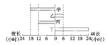 5、单选题 北京时间2013年6月21日13时04分,我国迎来2013年的夏至。下图为进入夏至时甲、乙、丙、丁四地的昼夜长短状况图。读图回答下题。