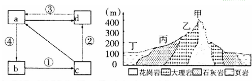 1.在岩石圈物质循环简图中,①~④对应的地质作用正确的是2.左图中的地质作用与右图中甲、乙、丙、丁四处岩石 的形成,相对应的是