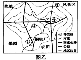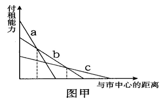 1.甲图中,线段a、b、c依次表示何种城市用地的付租 能力2.乙图中,地租分布等值线并不呈现同心圆,而是有明显的凹凸。造成局部地租分布等值线向城外凸出的主要因素是3.若要在乙图的①②③④处中选一处建大型仓储式超市,最好选在