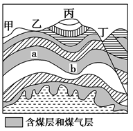 下列地点能够露天开采煤炭且比较安全的是 A.甲 B.乙 C.丙 D.丁