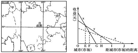 小题3:上右图是三种农作物(x、y、z)收益随距城市(市场)距离的变化而变化的示意图。为取得最佳经济效益,种植这三种农作物的界线应该是?? (  )